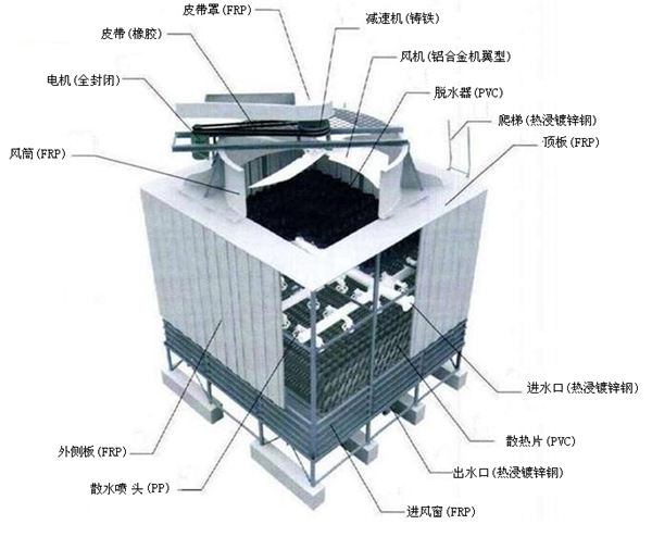塔体框架结构采用Q235热浸镀锌无焊缝式拼装;壳体(FRP)采用美国亚什兰最新改良材料,色泽均匀难褪色、抗老化。