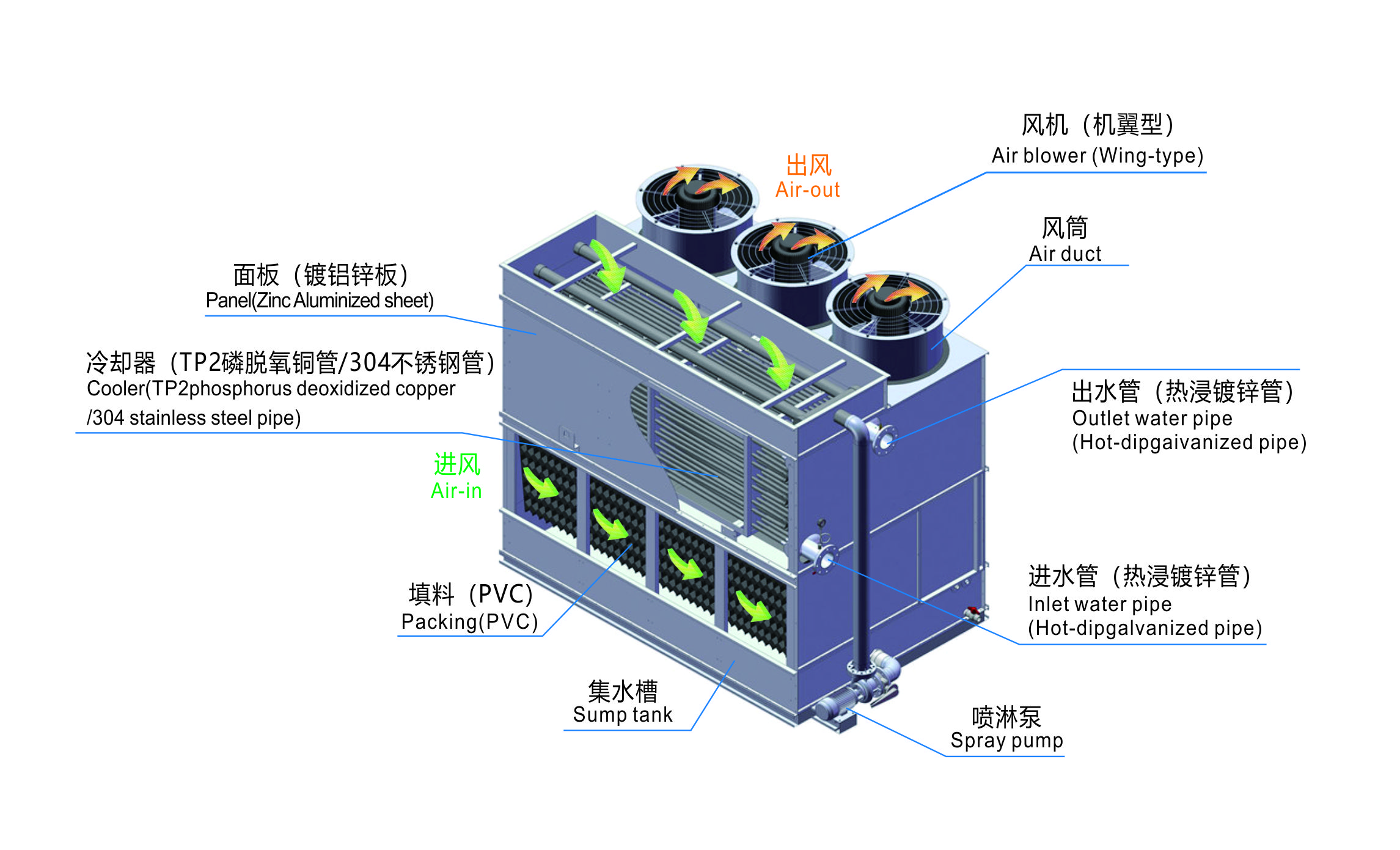 该系列冷却塔全部采用改良型高效换热器。换热盘管在传统基础上进行优化,采用椭圆形截面,可有效降低空气侧阻力,更适应较大的喷淋水量;由于管间距减小,提高了单位体积的换热管数量,增大了换热面积,换热效率明显提高。向下流动的管内工作液和向上流动的管外空气具有最佳的换热效果。整个换热器由一个或多个盘管组构成,四周均以钢框架箱围护,坚固耐用。盘管组材质为优级钢管,全部钢管均顺管内工作液流动方向适当倾斜,便于工作液流出,制作精良,并须经过2.5MPa的耐压检测才准予出厂,每件盘管均经过规范的热镀锌进行防腐。